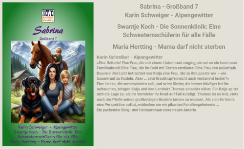 Ab sofort erscheinen die Print-Ausgaben u. a. der Romance-Serie »Sabrina« als Doppel- oder Dreifachbände. Heute ging meine Geschichte »Alpengewitter« zusammen mit zwei anderen Romance-Geschichten an den Start.