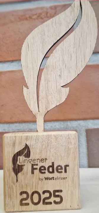 Der Preis ist übrigens eine hübsche Holzskulptur, die in der WfbM des Christophorus-Werks Lingen entstand. Der Schreibwettbewerb wurde von der Lingener Presse und der lokalen Radiostation Emsvechtewelle intensiv begleitet. Wer die Gelegenheit hat, sollte einen Blick in die Anthologie mit allen Texten von der Longlist werfen. Laut Aussage der veranstaltenden Agentur Wortglitzer gibt es das Buch beim LWT, bei Kunst und Buch Blanke und bei Thalia in Lingen zu erwerben.