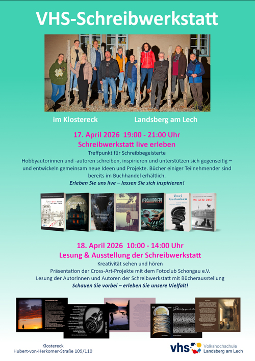 Natürlich ist auch die Schreibwerkstatt der VHS Landsberg mit von der Partie. Am Freitag (17. April) findet von 19 bis 21 Uhr ein regulärer Kursabend statt – kommt gern vorbei und schaut uns Schreiberlingen auf die Finger, wie wir an Texten basteln, (über-)arbeiten und mit uns ringen.