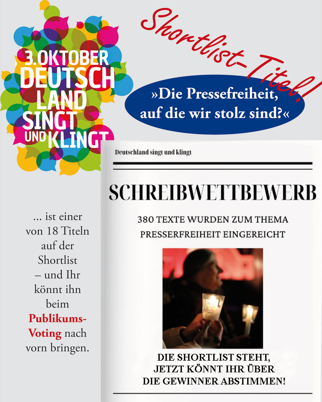 Ich freue mir hier grad ein Loch in den Bauch! Aus 380 Einsendungen hat es mein kleiner Essay zum Thema »Pressefreiheit« auf die Shorlist der besten 18 Texte geschafft, die aus der Feder von Autorinnen und Autoren über 26 Jahre stammen!