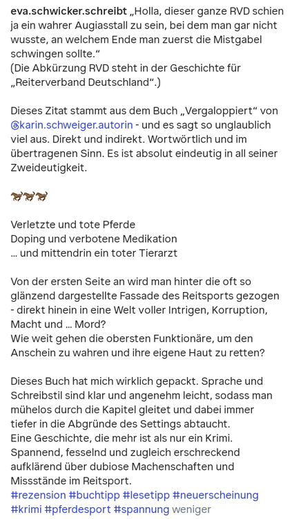Harry Schurrer, engagierter Kämpfer gegen Missstände im Pferdesport, liegt tot in seiner Wohnung. Anders als die Polizei ist seine Mitstreiterin Tamara Wagner überzeugt, dass er keines natürlichen Todes gestorben ist. Sie sucht auf eigene Faust nach seinem Mörder – und vor allem nach einer Antwort auf die Frage, welche Beweise der streitbare Tierarzt gegen hohe Pferdesport-Funktionäre in der Hand hatte.